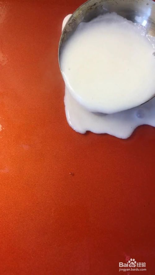 然后把烧开的牛奶平铺在披萨盘上,如下图所示。